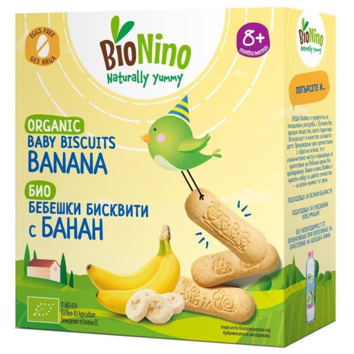 BioNino Organic Baby Biscuits Banana са вкусна и нежна био закуска, създадена специално за бебета над 8 месеца. Със своя мек бананов вкус и естествена сладост, тези бисквити са подходящи за ранния етап на захранване и за първите самостоятелни хапвания на малките откриватели. БиоНино Био бебешки бисквити с банан съдържат 5% органично бананово пюре и натурален бананов аромат, които придават приятен плодов вкус. Балансираната комбинация от оризово и пшенично брашно осигурява лека текстура, подходяща за бебешките нужди. Бисквитите се топят лесно в устата и са идеални за развиване на фините моторни умения на бебето. Без без яйца и без ГМО. Съдържат мляко и глутен.