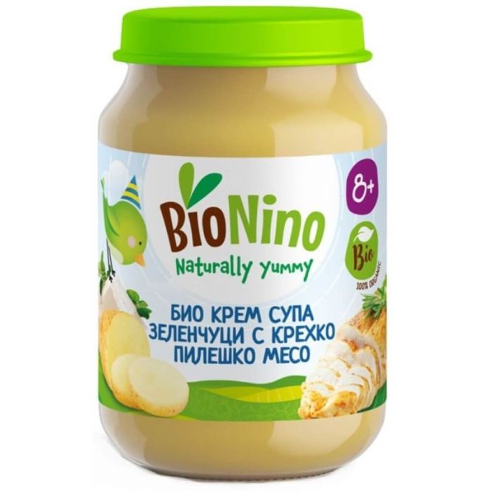 Вкусната BioNino Био крем супа със зеленчуци, сирене и пилешко месо 8М+ е пълноценна храна с чудесен вкус. Тя е подходяща за основно хранене на детето и съдържа балансирано съотношение между месо и зеленчуци. Има гъста, гладка консистенция, богата е на хранителни вещества и се усвоява лесно. Предназначена за деца над 8 месеца. Вложените при производството на BioNino Био крем супа със зеленчуци, сирене и пилешко месо съставки са с органичен произход.