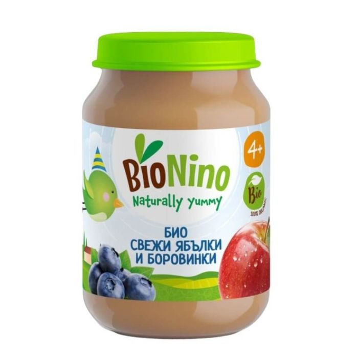 BioNino Био плодово пюре ябълка и боровинка 4М+ е готов, стерилизиран хранителен продукт, предназначен за консумация от кърмачета над 4 месеца. Вкусното пюре включва богати на витамин С боровинки и сладки на вкус ябълки. Допълва дневното хранене на детето и му осигурява здравословна храна, подходяща за периода на захранване. Може да се използва за десерт или междинна закуска. Продуктът е био, с изцяло органични съставки и има изключително гладка консистенция. BioNino Био плодово пюре ябълка и боровинка е без добавена захар и консерванти. 100% плодов продукт.