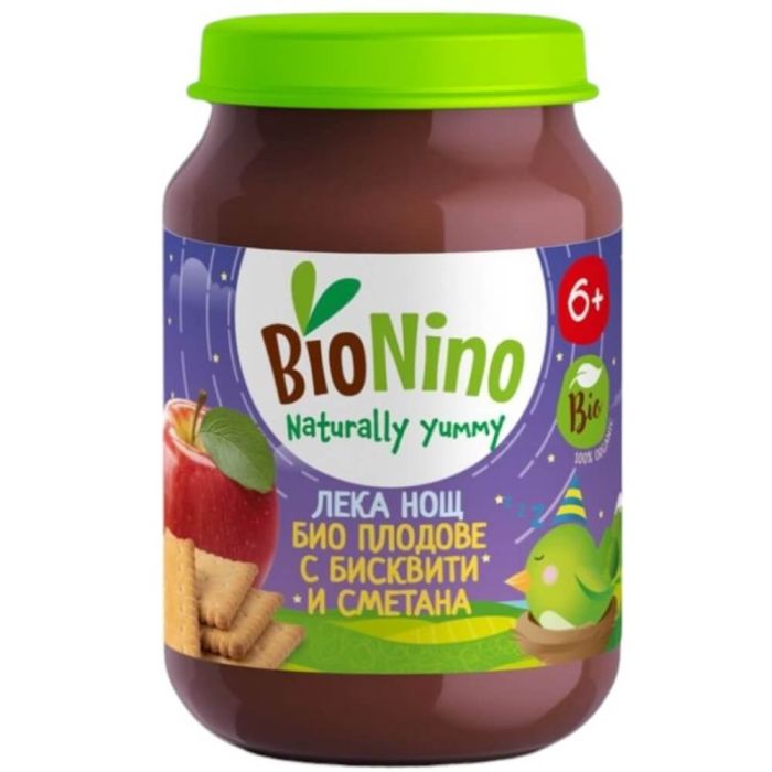 BioNino Био пюре лека нощ плодове с бисквити и сметана 6М+ ще засити детето преди сън и ще въведе нови вкусове в ежедневното му хранене. С внимателно комбинирани съставки то е подходящо за бебета над 6 месеца. BioNino Био пюре лека нощ плодове с бисквити и сметана съдържа ценни вещества, без консерванти и добавена захар.