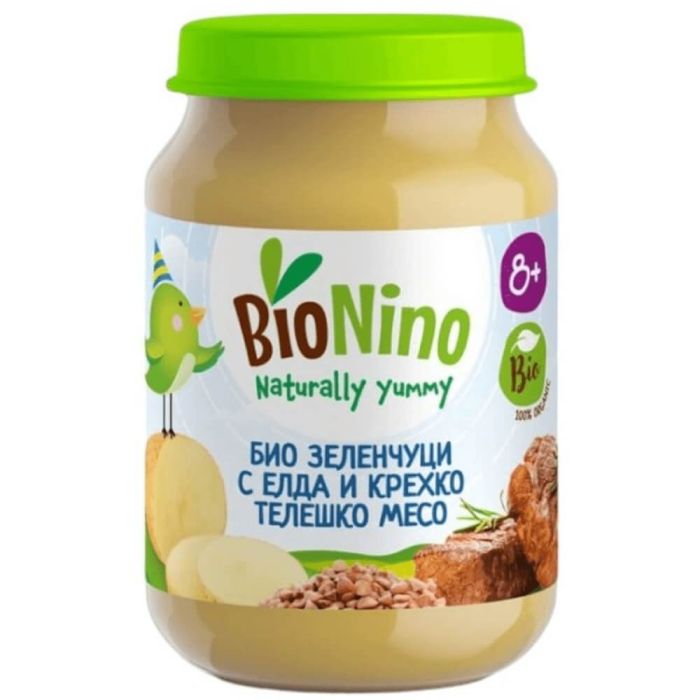 Вкусното BioNino Био пюре зеленчуци с елда и телешко месо 8М+ е пълноценна храна с чудесен вкус. Подходяща за основно хранене на детето над 8-месечна възраст. Съдържа балансирано съотношение между месо, елда и зеленчуци. BioNino Био пюре зеленчуци с елда и телешко месо, предоставя на организма витамини, протеини и минерали. Богато е на хранителни вещества и се усвоява лесно от децата.