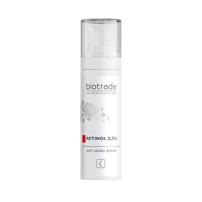 Биотрейд Серум против бръчки с ретинол 0,5% e серум,който намалява фините линии и бръчки, стимулира синтеза на колаген и обновяването на клетките, изглажда и стяга кожата. Подходящ за всеки тип кожа. Формулата съдържа ново четвърто поколение ретиноид "hydroxypinacolone retinoate", който е с високоефективно и бързо действие и не дразни кожата. Biotrade Retinol 0,5% Anti-Aging Serum е с усъвършенствана и доказано ефективна форма на витамин А, която се синтезира от ретиноева киселина и малка молекула pinacol. Тя осигурява мигновена пенетрация на продукта в кожата, без загуби. HPR действа много по-бързо и ефективно върху признаците на стареене: фини линии, бръчки, загуба на плътност и обем, хиперпигментации, докато в същото време формулата е изключително стабилна и няма почти никакво дразнещо действие. Дерматологично тестван продукт.