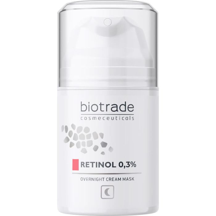 Biotrade Retinol 0,3% Overnight Cream Mask е нощна крем-маска за лице, която намалява фините линии и бръчки, изравнява тена, увеличава еластичността и възвръща блясъка на кожата. Формулата с ретинол, витамин B5 и пробиотик хидратира и видимо редуцира признаците на стареене. Съдържа ново 4 –то поколение ретиноид - hydroxypinacolone retinoate (HPR), който се отличава с по-висока ефективност и бързо действие от стандартните ретиноли. Той се активира директно в кожата, без да има нужда от допълнителна стъпка на метаболизиране. HPR е нежен към кожата - не дразни и зачервява, което означава, че въвеждането му в ежедневната анти-ейдж рутина не изисква време за адаптация. Има отличен профил на толерантност и е много стабилен. За разлика от другите ретиноли, той не губи своята активност след отваряне и остава ефективен за много по-дълго време. Биотрейд Нощна крем-маска с ретинол 0,3% действа в дълбочина през цялата нощ, за да придаде на кожата по-сияен, свеж и младежки вид на сутринта. Дерматологично тестван продукт.