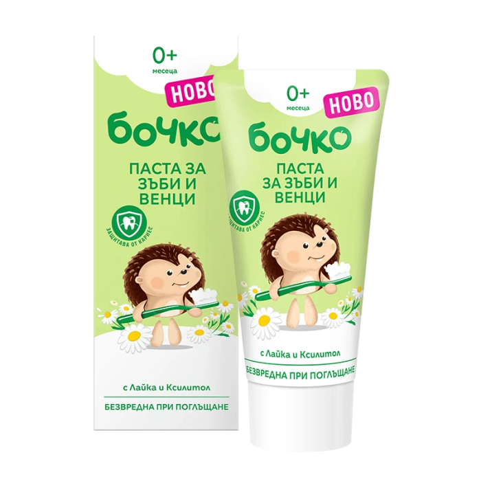 Бочко Паста за зъби и венци 0М+ осигурява комплексна грижа за млечни зъбки и венци и допринася за добра устна хигиена в периода на никнещите зъбки. Специалната формула е с ниска абразивност за нежно почистване, с грижа към повърхността на венците и млечните зъбки при бебето и малкото дете. Съдържа пребиотик – натурален ксилитол, който потиска развитието на бактерии, причиняващи кариес, защитава венците от възпаление и заздравява емайла на зъбите. С добавени екстракти от шипка, лайка и салвия, които допринасят за възстановяване и успокояване на венците. Бочко Паста за зъби и венци 0М+ не съдържа мента, флуор, оцветители, консерванти и титаниев диоксид. Безвредна при поглъщане.