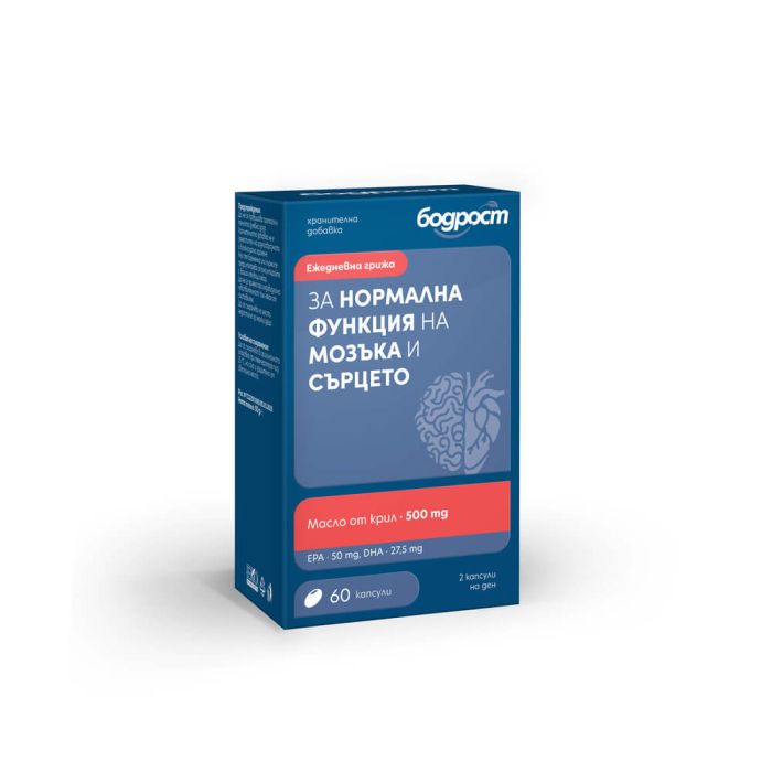 Бодрост за нормална функция на мозъка и сърцето съдържа масло от антарктически крил - малки ракообразни, които живеят в Антарктическия океан. Маслото от антарктически крил съдържа ненаситени мастни киселини – омега-3 мастните киселини (EPA и DHA), фосфолипиди и астаксантин. Има двойно по-висока бионаличност – маслото от крил е с двойно по-висока бионаличност спрямо рибеното масло. Мастните киселини са под формата на фосфолипиди. Със силно антиоксидантно действие - маслото от крил съдържа астаксантин. Астаксантин е антиоксидант, който е 65 пъти по-силен от Вит. С и 14 пъти спрямо Вит. Е. Бодрост за нормална функция на мозъка и сърцето понижава лошия холестерол – маслото от крил намалява „лошият холестерол“ (LDL) с 32% за 3 месеца. Без "рибен дъх".