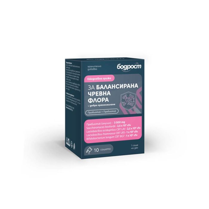 Бодрост за балансирана чревна флора и добро храносмилане е синбиотик, който комбинира четири внимателно подбрани пробиотични щама – Saccharomyces boulardii, Lactobacillus acidophilus, Lactobacillus rhamnosus, Bifidobacterium longum, както и пребиотик инулин. Бодрост за балансирана чревна флора и добро храносмилане е подходяща за деца над 3-годишна възраст. Тази синбиотична формула: