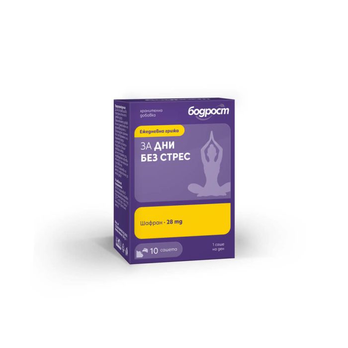 Бодрост за дни без стрес е хранителна добавка под формата на саше, което се разтваря директно в устата. Съдържа стандартизиран екстракт от цветовена шафран (Affron®). Екстрактът от шафран подпомага вътрешното спокойствие, психическото благополучие и доброто настроение. Бодрост за дни без стрес e подходяща за възрастни в периоди на повишено напрежение, тревожност или при нужда от подкрепа за качествен сън. Удобен за прием по всяко време и място, без нужда от вода. Активната съставка Affron® е научно проучена за своето положително въздействие върху настроението, усещането за спокойствие и качеството на съня.