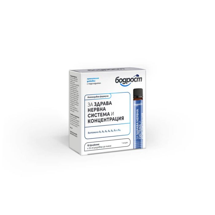 Бодрост за здрава нервна система и концентрация е хранителна добавка с интензивна формула, включваща витамини от група B (B1, B2, B3, B5, B6, B7 и B12), подпомагащи организма в периоди на повишена умствена и физическа натовареност, стрес, честа умора и липса на концентрация. Витамините от група B допринасят за нормалното протичане на метаболизма и производството на енергия. Освен това, те подпомагат нормалния метаболизъм на основните хранителни вещества (белтъчини, въглехидрати и мазнини). Витамините B1, B2, B3, B6, B7 и B12 допринасят за нормалното функциониране на нервната система и нормална психична функция. Витамините B2, B3, B5, B6 и B12 допринасят за намаляване на чувството за отпадналост и умора. Бодрост за здрава нервна система и концентрация е подходяща за възрастни и деца над 12-годишна възраст.