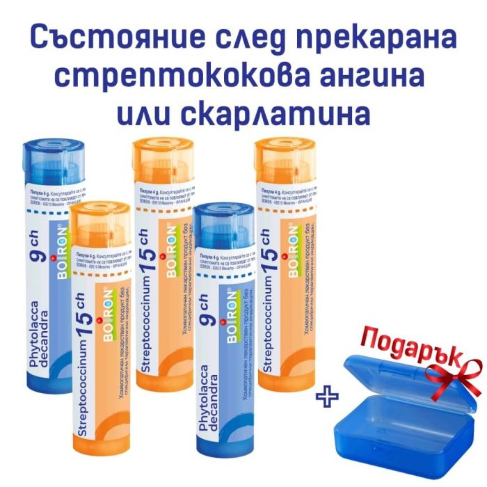 Комплектът съдържа: Boiron Streptococcinum Стрептококцинум 15 СН 3 бр + Boiron Phytolacca decandra Фитолака декандра 9 СН 2 бр + Подарък: кутия 1 бр.