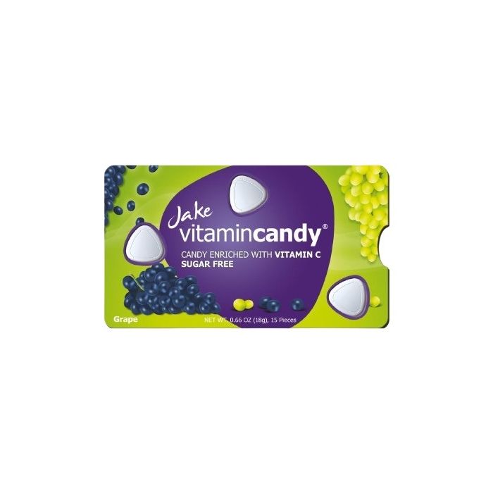 Jake Vitamincandy Grape представляват бонбони обогатени с витамини. Те са без добавена захар и глутен, без изкуствени оцветители, с интензивен плодов вкус. Нискокалорични. Джейк Витаминкенди Бонбони грозде с витамин C са с вкус на сладка малина, съдържат витамин C.