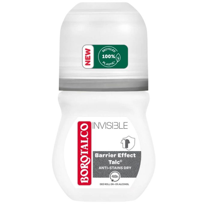 Borotalco Invisible Deo Roll on е линия дезодоранти, създадени да ограничат следите и петната върху дрехите. Ефективни за бели и жълти петна, дори и върху деликатни тъкани като коприната. Със силата на Microtalc, който абсорбира потта и оставя кожата суха. Бороталко Инвизибъл Део рол он има ненатрапчив аромат, характеризиращ се с леко кехлибарени, флорални нюанси, с устойчив талков завършек.