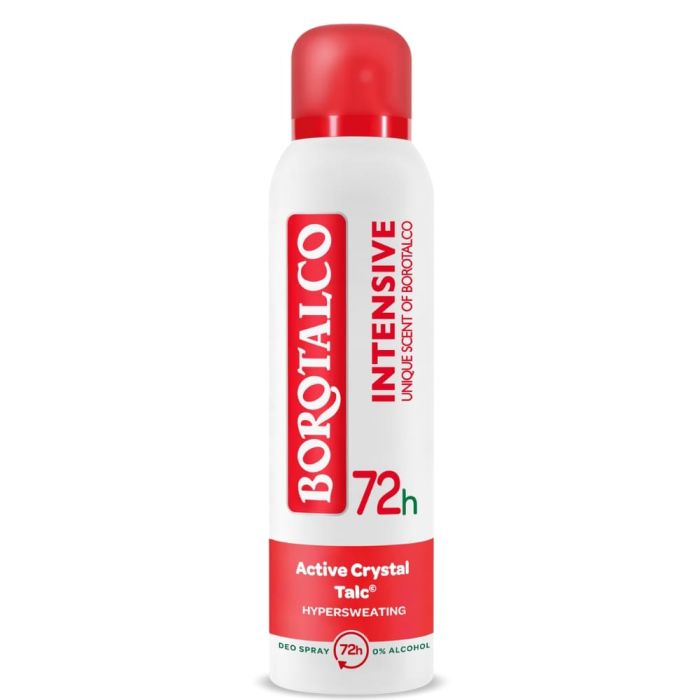 Borotalco Intensive Deo Spray e део спрей, който осигурява ефикасност срещу изпотяването през целия ден, дори в моменти на интензивен живот. Неговата свръхефективна формула съдържа иновативния и патентован Active Crystal TalcTM за тройна суха защита: предотвратява, абсорбира и неутрализира потта. Бороталко Интензив Део спрей е с приятен дълготраен аромат.