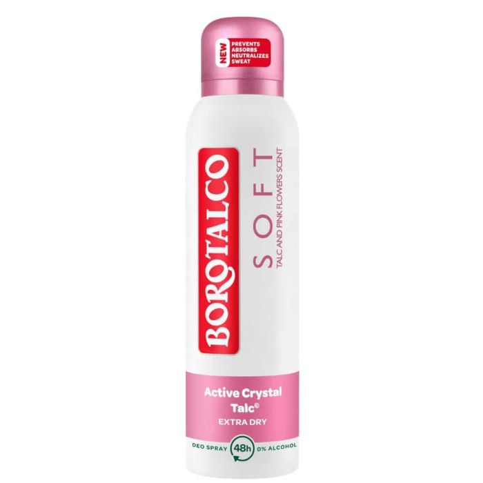 Borotalco Original Deo Spray e део спрей, който предоставя тройна защита, осигуряваща комфорт през цялото време благодарение на своят иновативен и патентован Active Crystal TalcTM. Бороталко Софт Део спрей предотвратява изпотяването, като ограничава образуването му и неутрализира молекулите, предизвикващи потенето. Деликатна и обгръщаща инфузия от флорални нотки и момина сълза.