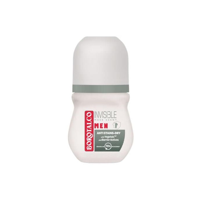 BOROTALCO Men Dry Amber Deo Roll On e део рол он за мъже, който осигурява пълна защита от изпотяване и петна. Ексклузивната формула, обогатена с Vegetalc™ – смес от натурални абсорбиращи пудри – и Barrier Actives: мрежа от невидими молекули, които улавят и не пренасят ореоли, миризми и петна върху дрехите, като същевременно осигуряват защита против изпотяване. Ефективен срещу бели и жълти петна, дори върху деликатни тъкани като ризи или сака. Бороталко Мен Драй Инвизибъл Мъск Део рол он за мъже има аромат, който е комбинация от ориенталски мускусни нотки, освежени от ароматен фужерен акорд, разкриващ фината изтънченост на благородните дървесни акорди на заден план. Ефикасност на дезодоранта до 72 часа. 0% алкохол. Дерматологично тестван.
