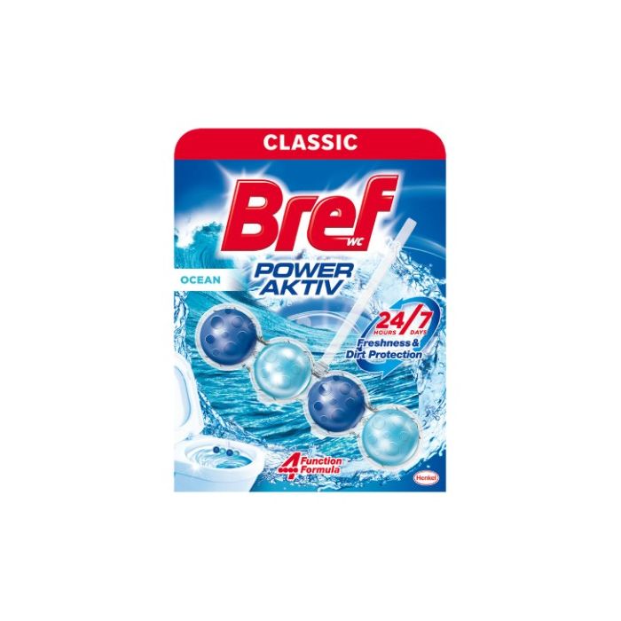Bref WC Power Active Ocean ароматизатор предотвратява натрупването на варовик по тоалетната чиния и премахва неприятните миризми. Бреф Пауър Актив Океан е с твърда форма и отделя своя свеж аромат дълго време без да губи от силата си. Действие 24/7.