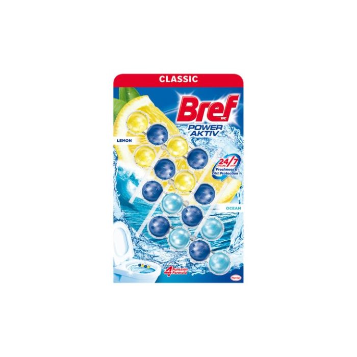 Bref Classic WC Power Active Lemon / Ocean ароматизатор за тоалетна чиния премахва неприятните миризми и предотвратява натрупването на котлен камък по тоалетната чиния. Със силата на своите 4 активни съставки образува богата пяна, почиства и освежава. Бреф Класик Пауър Актив Лимон /Океан отделя своя комбиниран аромат дълго време без да губи от почистващата си сила. Действие 24/7.