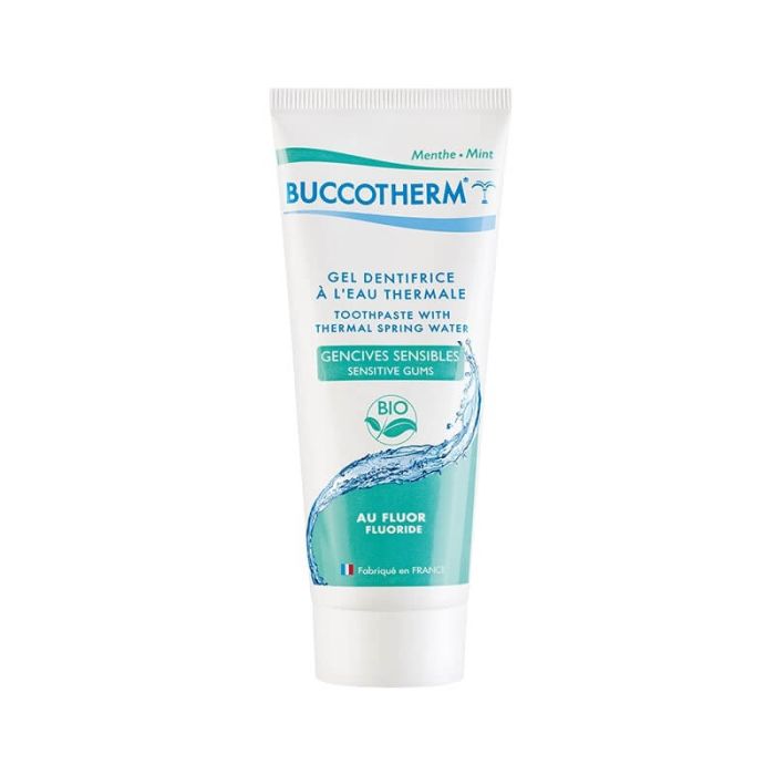 Buccotherm Sensitive Gums Fluoride Toothpaste е органично сертифициранa гел за паста за зъби, съставен от 100% естествени съставки. С термалната вода Castéra-Verduzan, изключителна вода с успокояващи и реминерализиращи свойства. Букотерм Био гелообразна паста за зъби за чувствителни венци успокоява дразненето, намалява кървенето и чувствителността на венците. В него има добавена флуор (1450 ppm), препоръчана от здравните власти за предотвратяване появата на кариесбразуването на кариес. С природен аромат на свежа мента, която придава продължително чувство за свежест.