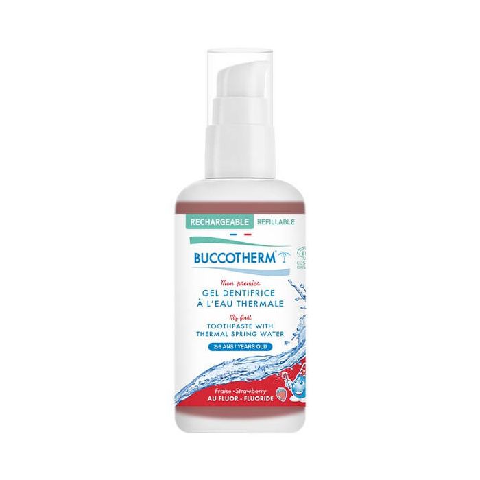 BUCCOTHERM Kids My First Toothpaste Organic Сertified е гел паста за зъби, адаптирана към децата и техния вкус. Съдържа 98% натурални съставки и е с естествен вкус на ягода. Букотерм Био детски гел за зъби с аромат на ягоди 2-6 години е без захар и химически добавки. Съдържа успокояваща и реминерализираща термална вода Castéra-Verduzan, която помага за предотвратяване на зъбната плака и в борбата с кариеса на млечните зъби, като същевременно запазва венците. Обогатена с флуор за профилактика на кариес на млечните зъби. Продуктът е подходящ за деца от 2 до 6 г. С природен аромат на ягода.