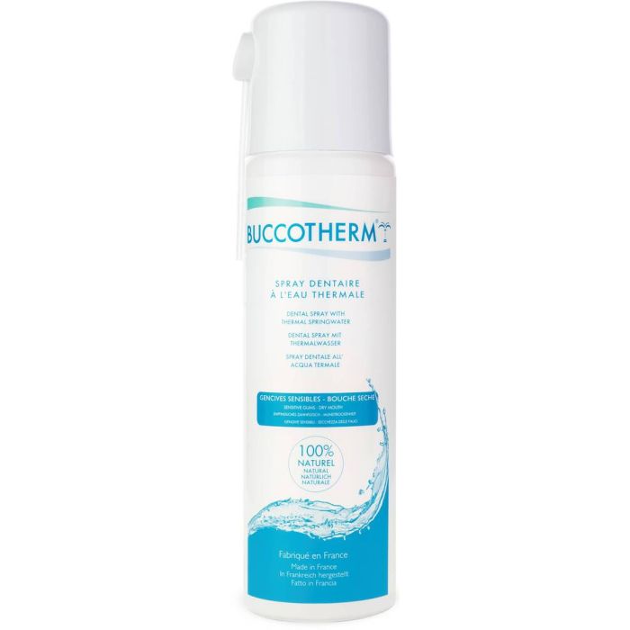 BUCCOTHERM Dental Spray 100% Natural е дентален спрей, който съдържа 100% термална вода от Castera-Verduzan, която има силно изразено антибактериално, успокояващо и заздравяващо действие. Помага за намаляване на възпаленията, раздразненията и чувствителността на венците. Букотерм Дентален спрей е подходящ за цялото семейство: кърмачета, деца, възрастни, хора със зъбни скоби.