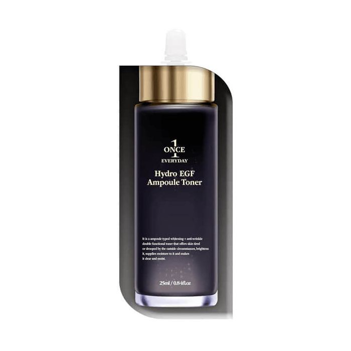 Chamos Once Everyday Hydro EGF Ampule Toner e хидратиращ тонер-серум за лице с подмладяващ пептиден комплекс, който възстановява еластичността, изглажда фините линии и придава естествено сияние. Концентрираната формула с високо съдържание на протеин действа едновременно като есенция и серум, като само няколко капки са достатъчни за видимо по-гладка и жизнена кожа. Чамос Хидратиращ тонер-серум за лице изсветлява пигментните петна, минимизира порите и подпомага синтеза на колаген, като подобрява структурата и тонуса на кожата. Хидролизираният колаген и хиалуроновата киселина осигуряват дълбока и дълготрайна хидратация, докато бета-глюканът поддържа кожата здрава и устойчива. Ниацинамидът и аденозинът допринасят за изравняване на тена и редуциране на бръчките. Подходящ е за чувствителна и дехидратирана кожа, при разширени пори, след грим или при усещане за сухота след почистване. Малката опаковка запазва свежестта и ефективността на активните съставки, като същевременно е удобна за ежедневна употреба навсякъде.