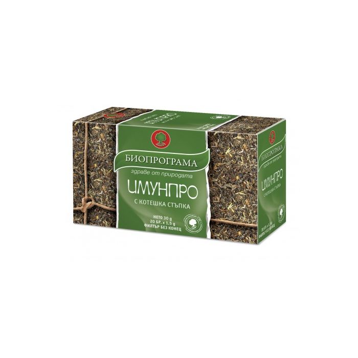 Биопрограма Чай Имунопро за имунитет съдържа комбинация от билки, която има доказано добро действие за функциите имунната система и съдейства за преодоляване на простудни заболявания. Приемът на чая стимулира кръвообращението и обмяната на веществата и подобрява функциите на храносмилателната и дихателната система. Биопрограма Чай Имунопро за имунитет е базиран на висококачествени билки събрани от екологично чисти райони и включва в състава си шипка, ехинацея и котешка стъпка.