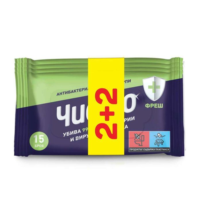 Комплектът съдържа: Чисто Антибактериални мокри кърпи Фреш 4 х 15 бр.