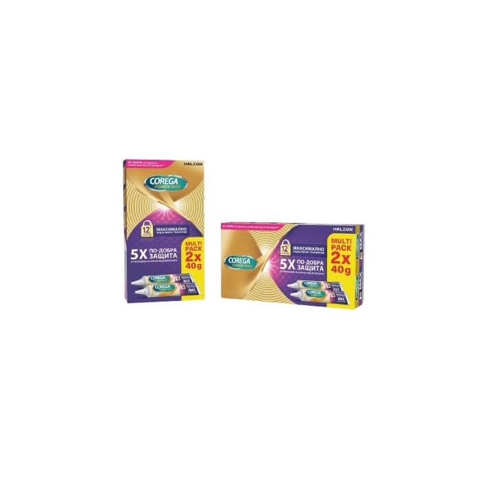 Комплектът съдържа: Corega Max Seal крем за протези дуо 40 г 2 бр.
