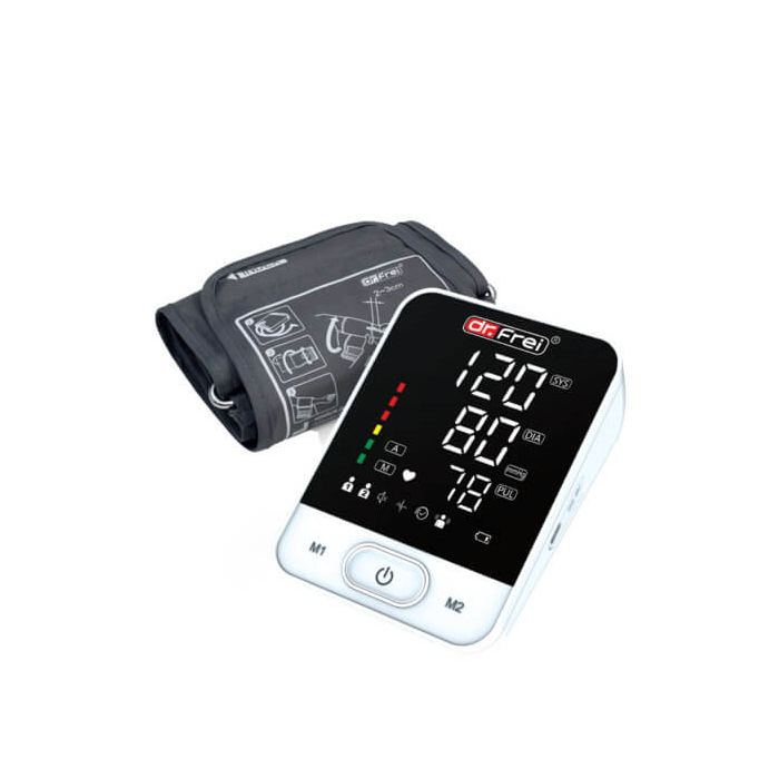 Dr. Frei M-MAX e aвтоматичен апарат за измерване на кръвно налягане с индикатор за сърдечна аритмия и уголемен конусовиден маншет 22-42 см. Запаметяване на 100 стойности за двама потребители, изчислява средната стойност на 3 последни измервания. С включен адаптер и кабел. Автоматичен апарат за измерване на кръвно налягане Др. Фрей M-Макс има индикатор за движение и индикатор на маншета. Калъф за съхранение. LED дисплей. Гласово излъчване на 5 езика (включително и български). Гаранция 5 години.