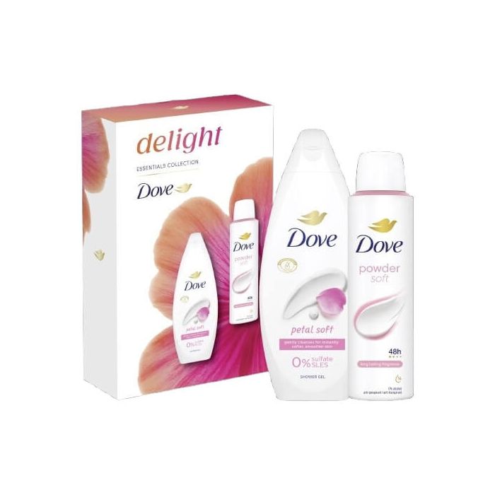 Комплектът съдържа: Dove Petal Soft Хидратиращ душ гел 250 мл 1 бр + Dove Powder Soft Дезодорант спрей против изпотяване за жени 150 мл 1 бр.