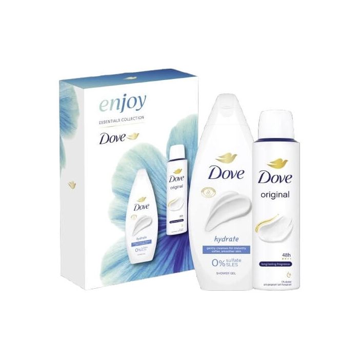 Комплектът съдържа: Dove Hydrate Хидратиращ душ гел 250 мл 1 бр + Dove Advanced Care Original Дезодорант спрей против изпотяване за жени 150 мл 1 бр.