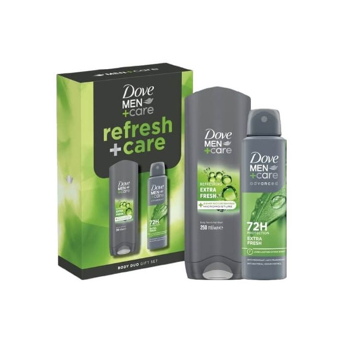 Комплектът съдържа: Dove Men+Care Advanced Extra Fresh Дезодорант спрей против изпотяване за мъже 150 мл 1 бр + Dove Men+ Care Extra Fresh Подхранващ душ-гел за лице и тяло за мъже 250 мл 1 бр.