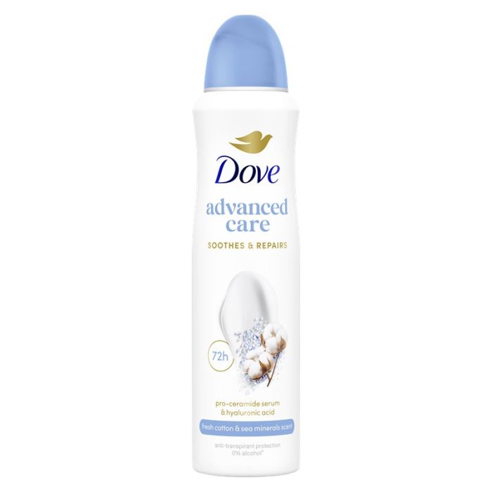 Dove Fresh Cotton & Sea Minerals осигурява дълготрайна свежест и надеждна защита до 72 часа, като същевременно се грижи за кожата. Свежият аромат на чист памук и морски минерали създава усещане за чистота и комфорт през целия ден. Нежната формула е без алкохол и е деликатна към кожата. Обогатен със серамиди и хиалуронова киселина Дав Фреш Котън енд Сий минералс Дезодорант спрей 72 ч успокоява, хидратира и балансира кожата, като комбинира ефективна защита срещу изпотяване с усещане за лекота и свежест.