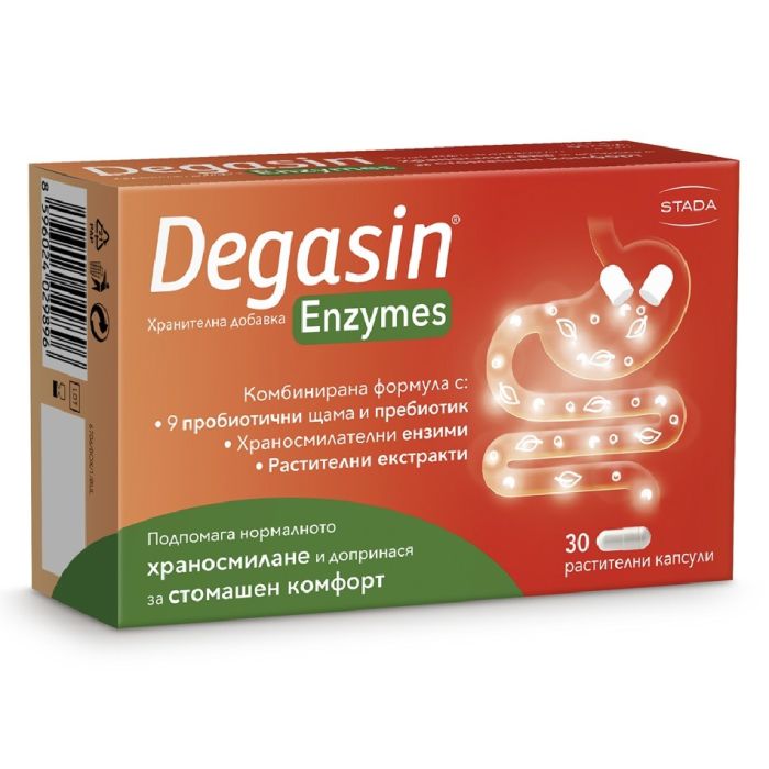 Degazin Enzimes е хранителна добавка подкрепяща нормалното храносмилане и стомашно-чревния комфорт. Формулиран с храносмилателни ензими и с 9 пробиотични щама и растителни екстракти Дегазин Ензими допринася за поддържане на стомашно-чревния тракт и чревната микробиота. Балансираната формула спомага за ограничаване на газовете и подуването. Мултиензимният комплекс способства за ефективно разграждане на храната и съдържа Протеаза, Амилаза, Липаза и Пептидаза. Билковият джиестив е формулиран с мента, анасон, див копър и кориандър. Може да се приема от възрастни, бременни и кърмещи жени и деца над 3 години.
