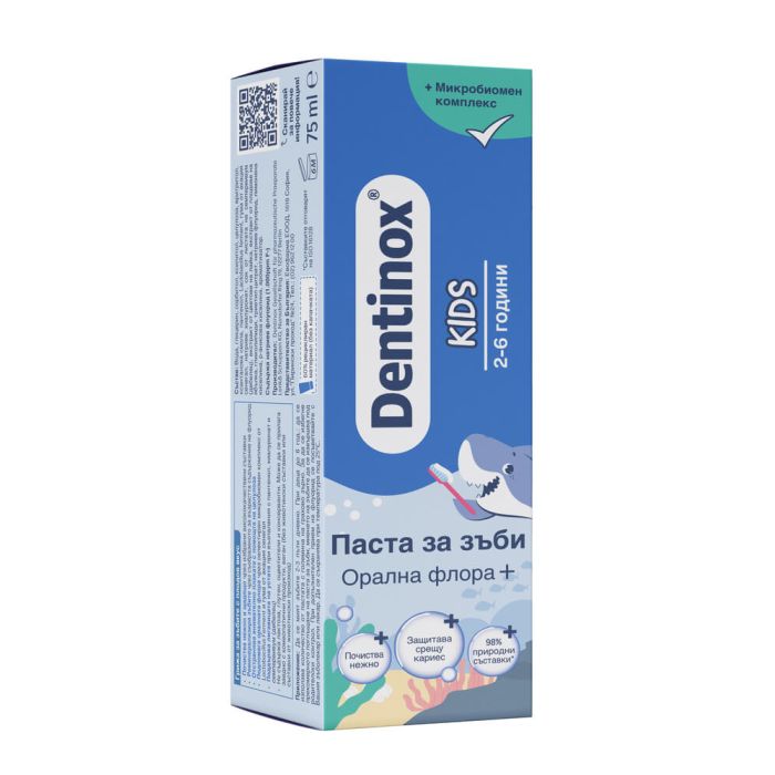 Dentinox Kids Паста за зъби Орална флора+ осигурява ефективна защита срещу кариес. Формулата съдържа ксилитол и флуорид. Дентинокс Кидс аста за зъби Орална флора+ реминерализира зъбите чрез съобразеното за възрастта съдържание на флуорид (1.000 ppm F-). Почиства особено нежно и щадящо. Отстранява плаката особено внимателно с помощта на целулоза. Подпомага оралната флора чрез селектиран микробиомен