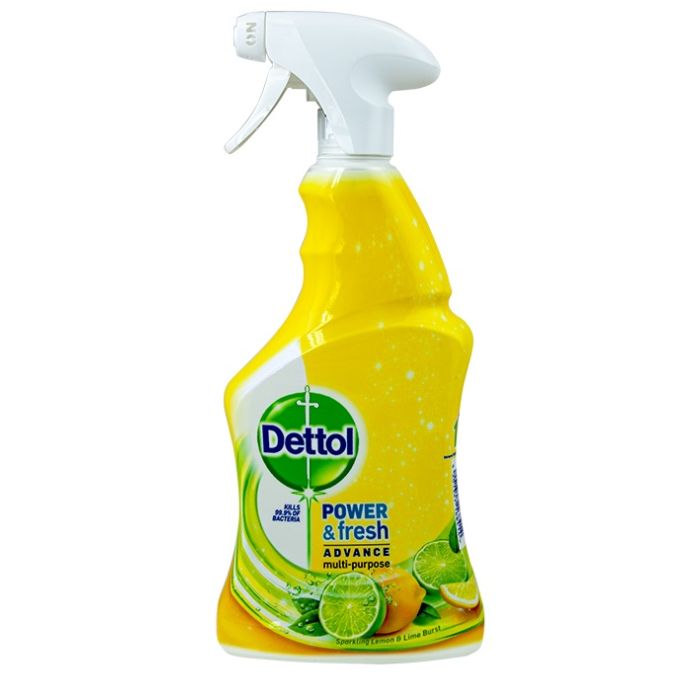 Dettol Power & Fresh Complete Cleanser Lemon Multipurpose Spray представлява антибактериален дезинфектант за повърхности, който осигурява защита от бактерии, вируси на настинка и грип, както и алергени. Има три пъти по-голяма почистваща сила oт Антибактериален почистващ спрей Original. Той осигурява усъвършенствано антибактериално почистване и дезинфекция с аромат на цитрус, оставяйки свеж аромат. Детол Лимон Антибактериален спрей за повърхности убива 99.9% от тестваните бактериите от типа на ешерихия коли, и премахва грипните вируси. Със своята тройно по-силна почистваща мощност, спреят успешно премахва мазнини, загоряла храна, замърсяванията в банята, както и всякакви ежедневни замърсявания. Подходящ е за кухненски повърхности, душ кабини, плотове на готварска печка, кошчета, вани и кранове, мивки, подове, тоалетни дъски. Предлага се в опаковка от 500мл.