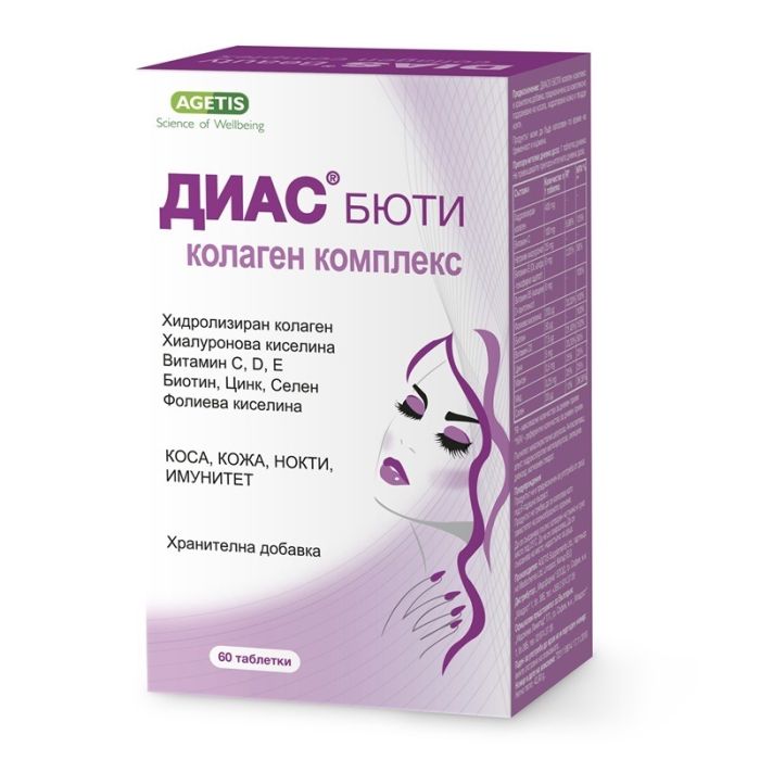 Диас Бюти Колаген комплекс е хранителна добавка насочена да подкрепи добрият вид на кожата, косата и ноктите. Осигурява цялостна грижа за естествения цвят, добрата структура и хидратация на кожата. Комплексът осигурява 3-степенно въздействие – доставя лесно усвоими колагенови пептиди тип I, II и III; стимулира естественото производство на колаген в тялото чрез добавената хиалуронова киселина и подсилва усвояването на пептидите; спомага общия имунитет на организма чрез комбинация от витамини и микроелементи с висока концентрация. Стимулира здравината на ноктите, допринася за заздравяване на косъма и възвърща естественият блясък. Добавените във формулата на Диас Бюти Колаген комплекс витамини и минерали допринасят за общото укрепване на организма. Витамин C играе ключова роля в образуването и възстановяването на колагена, което го прави жизненоважен за здравината на междуклетъчните структури, кожата, сухожилията, ставите, костите и мускулите, както и за правилното функциониране на сърдечно-съдовата и кръвоносната система.Витамин E защитава кожата от вредното въздействие на свободните радикали и оксидативния стрес.Витамин D подпомага поддържането на хормоналния баланс, нормалната дейност на имунната система и правилната функция на щитовидната жлеза.Витамините от група B имат съществено значение за редица жизненоважни процеси в организма. Микроелементите цинк, манган, мед и селен допринасят за покриване на ежедневните потребности на тялото, като подпомагат поддържането на енергия, жизненост и добро общо здравословно състояние.