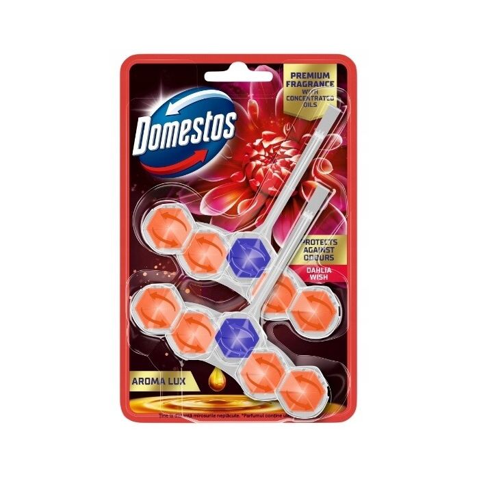 Domestos WC Aroma Lux Dahlia Wish е твърд тоалетен блок, който осигурява пълна грижа за вашата тоалетна. След всяко промиване оставя богата пяна, която помага да се предотврати образуването на варовик, премахва примесите, изсветлява тоалетната чиния и отделя приятен аромат по време на нейната употреба. Доместос Арома Лукс Далия има премиум аромат на цветя Dahlia и съдържа силно концентрирани ароматни масла, което гарантира, че тоалетната мирише приятно през цялото време.