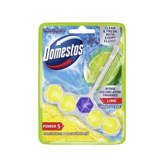 Domestos Lime Power 5 е тоалетно блокче, който осигурява ефикасно почистване и дезинфекциране на тоалетната чиния чрез 5 действия: създава обилна пяна, предотвратява варовикови натрупвания, оставя дълготраен аромат, придава сияен блясък и хигиенизира. Със свеж аромат на лимон, който се задържа дълготрайно, тоалетно блокче Domestos гарантира постоянна чистота и свежест в тоалетното помещение. Доместос Лайм Пауър 5 ароматизира, премахва неприятните миризми и предпазва от вредни бактерии.