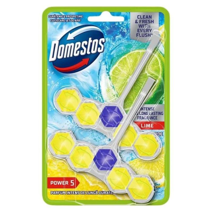 Domestos Lime Power 5 е тоалетно блокче, който осигурява ефикасно почистване и дезинфекциране на тоалетната чиния чрез 5 действия: създава обилна пяна, предотвратява варовикови натрупвания, оставя дълготраен аромат, придава сияен блясък и хигиенизира. Със свеж аромат на лимон, който се задържа дълготрайно, тоалетно блокче Domestos гарантира постоянна чистота и свежест в тоалетното помещение. Доместос Лайм Пауър 5 ароматизира, премахва неприятните миризми и предпазва от вредни бактерии.