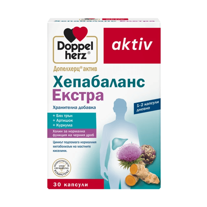 Doppelherz Aktiv Hepabalance Extra e хранителна добавка с подобрена формула за още по-комплексна подкрепа на черния дроб. Формулата съдържа комбинация от бял трън, артишок, куркума и холин.