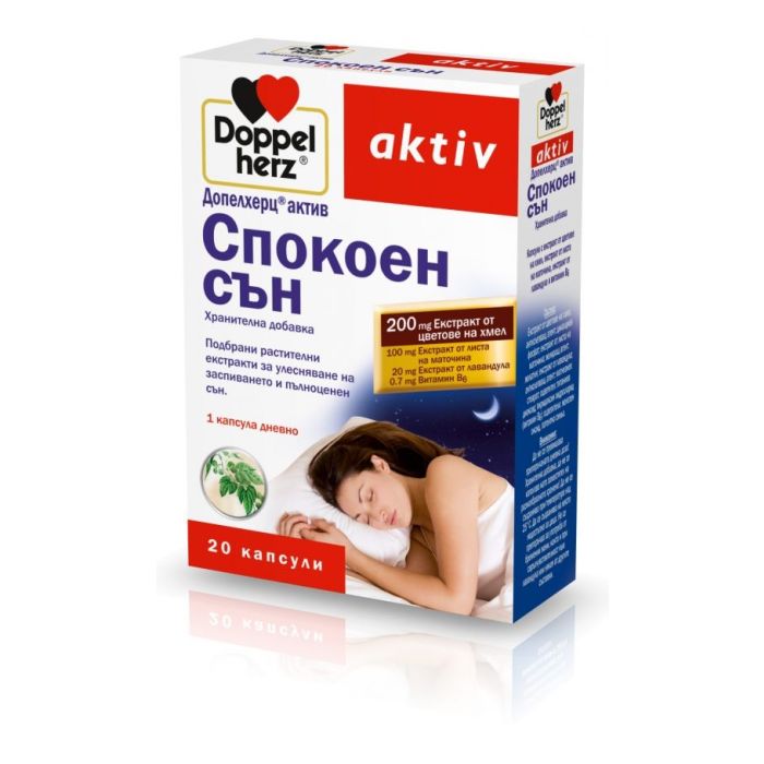 Doppelherz Aktiv Спокоен сън е хранителна добавка, която съдейства за подобряването на качеството на съня и ускорява процеса на заспиването. Допелхерц Актив Спокоен сън съдържа комбинация от висококачествени натурални екстракти от хмел, маточина, лавандула, към които е добавен витамин В6. Добавката подпомага баланса и функциите на нервната система, която има пряко влияние върху пълноценността на съня. Приемът й съдейства за справянето със симптомите на умора и отпадналост, които придружават недоспиването и ви помага да се събуждате с тонус и енергия. Не води до привикване.