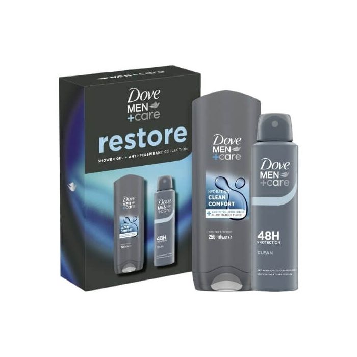 Комплектът съдържа: Dove Men+Care Advanced Clean Comfort Дезодорант спрей против изпотяване за мъже 150 мл 1 бр + Dove Men+ Care Clean Comfort Душ гел за лице и тяло 250 мл 1 бр.