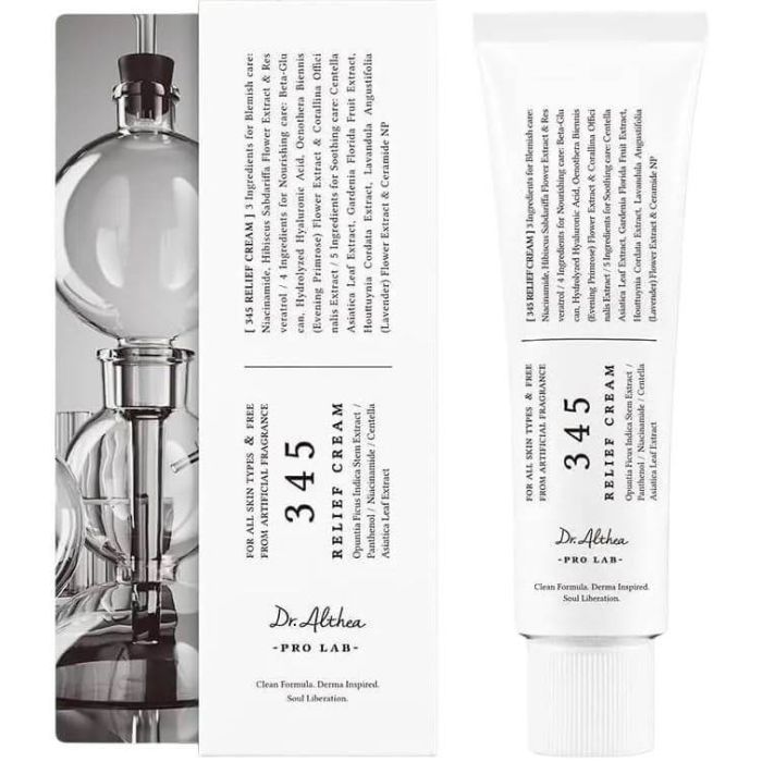 Dr. Althea 345NA Relief Cream е регенериращ крем, който е богат на хранителни вещества, като умело съчетава съставки за справяне с петна, подхранване на кожата и осигуряване на успокояваща грижа. Др. Алтеа 345НА Крем за лице е подходящ и за акне, като ефективно се справя с последствията от него без тежко усещане. Продуктът има многопластова кремообразна структура, която предлага цялостна и дълготрайна грижа за кожата, като осигурява непрекъсната хидратация и подхранване. Той съдържа мощна комбинация от ниацинамид, пантенол и екстракт от стъбла на Opuntia Ficus-Indica, всеки от които присъства в значителни концентрации (10 000 ppm), осигурявайки множество ползи за кожата.