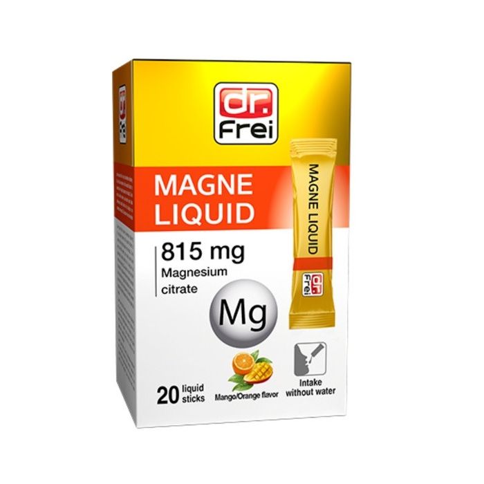 Dr. Frei Magnе liquid е хранителна добавка доставяща на организма органичен магнезиев цитрат в течна форма. Готовите за прием сашета са лесни за пренасяне и удобни за употреба. Магнезият допринася за: