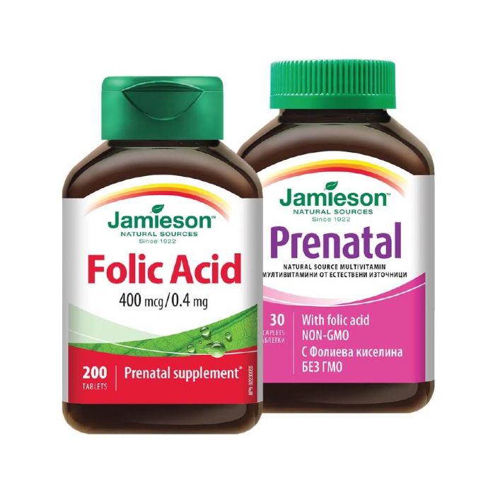 Комплектът съдържа: Jamieson Folic Acid Фолиева киселина 0,4 мг х 200 таблетки 1 бр и Jamieson Prenatal Пренатал мултивитамини за бременни x 30 таблетки 1 бр