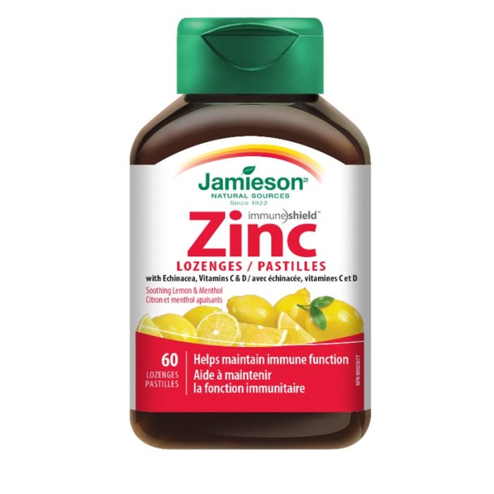 Jamieson Zinc Pastilles е хранителна добавка, съдържаща комбинация от цинк, ехинацея и витамини C и D. Цинкът е важен микроелемент и минерал, който участва в главни биологични процеси в организма, играе важна роля в метаболизма на протеините, въглехидратите, липидите и нуклеиновите киселини (РНК и ДНК). Джеймисън Цинк с ехинацея, витамин C и D c вкус на лимон е мощен антиоксидант. Той подпомага нормалния растеж и развитие и подобрява функциите на имунната система. Има приятен вкус на див лимон и мента и се предлага под формата на таблетки за смучене.