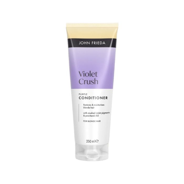 John Frieda Violet Crush Purple Conditioner е виолетов балсам, създаден да поддържа студени и сияйни руси тонове. Формулата с виолетови пигменти неутрализира жълтеникавите и медни оттенъци за по-платинено студено русо. Подхранващият ефект идва от Pro-Vitamin B5, който заздравява косъма и поддържа оптимална хидратация. Джон Фрида Виолетов балсам за руса коса против жълтеникави оттенъци изглажда косата, правейки я мека, лесна за разресване и блестяща. Подходящ е за естествена и боядисана руса коса, като защитава цвета между посещенията при стилист. Веган формула без силикони, която осигурява леко усещане, без да утежнява косата.
