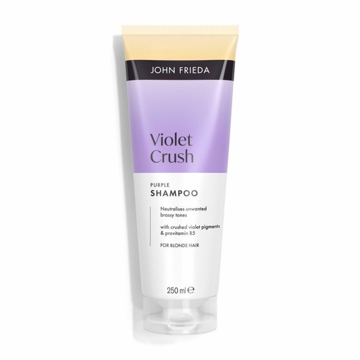 John Frieda Violet Crush Purple Shampoo е виолетов шампоан, който противодейства както на жълто-оранжевите, така и на упоритите медни тонове и спомага русите коси да изглеждат по-ярки и светли с естествен хладен тон. Джон Фрида Виолетов шампоан за руса коса против жълтеникави оттенъци е подходящ за естествени и боядисани блондинки и коса на кичури. Специалната формула съдържа сини пигменти, който премахват жълтите оттенъци. Без пероксид и амоняк. Дерматологично тестван продукт.