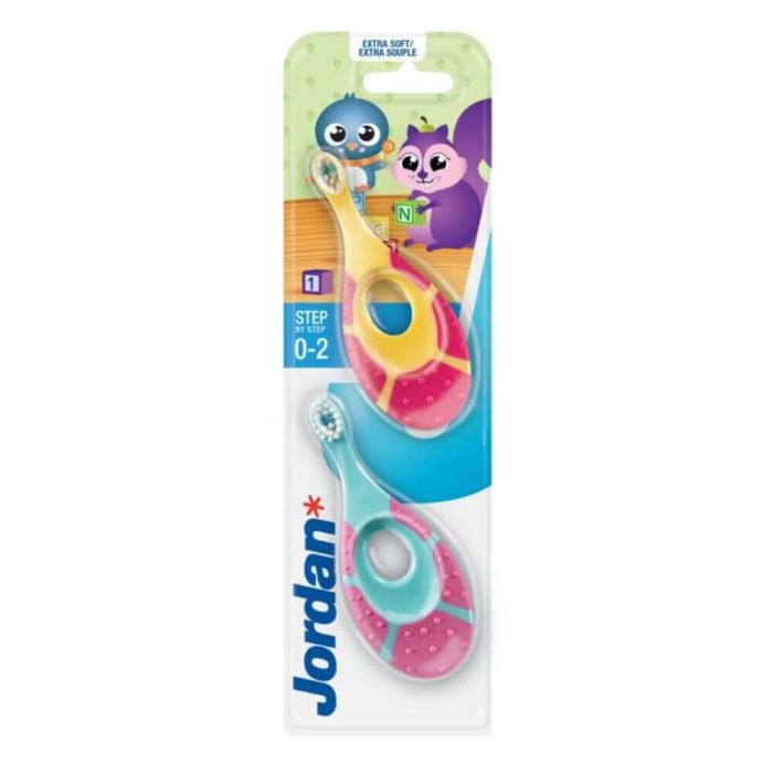 Jordan Step 1 Toothbrush е четка за зъби за деца от 0 до 2 години. Джордан Стъпка 1 Бебешка четка за зъби с гризалка има много меки влакна, мек пръстен за захапване-гризалка, ергономична дръжка удобна за големи и малки ръце (на родителите и на децата). Четката помага за създаването на първите здравословни и щастливи навици в миенето на зъбките. Късата дръжка предпазва от проникването на дълбоко в устата на детето. На тази възраст четката за зъби трябва да се използва от децата под родителски контрол, като дръжката на Jordan Step 1 е проектирана така, че да може да се използва и от родителите и от децата. Предлага се в четири различни цветови комбинации.