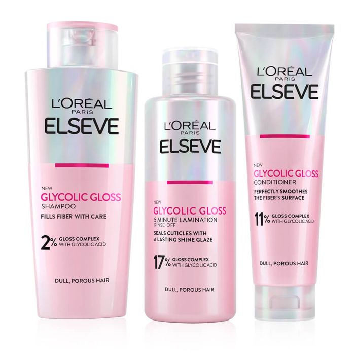 Elseve Glycolic Gloss Шампоан за коса без блясък 200 мл + Балсам за коса без блясък 150 мл + Ламинираща грижа за коса без блясък 200 мл Комплект